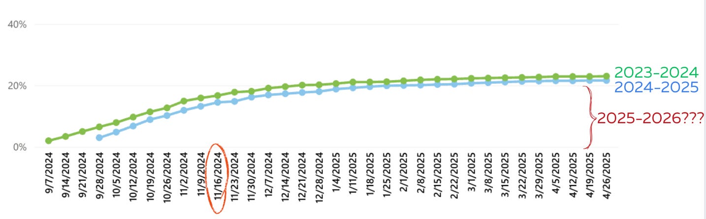 现在最大的疑问是:今年的疫苗接种率较低是否是因为小罗伯特·肯尼迪领导下的联邦政府混乱造成的?通常情况下,我们现在应该已经有了清晰的全国数据。但疾控中心的网站还没有更新——我希望这只是因为政府停摆,而不是出于其他更令人担忧的原因(比如恶意)。