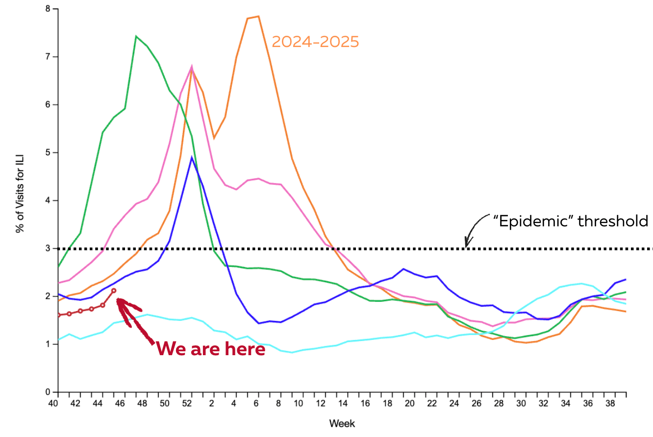 流感样病例开始缓慢上升(尤其是在路易斯安那州和南部各州),但仍低于“流行”阈值。(通常情况下,我会在机场或拥挤的室内场所戴上口罩,因为我可不想生病。)换句话说,情况还没那么糟糕。