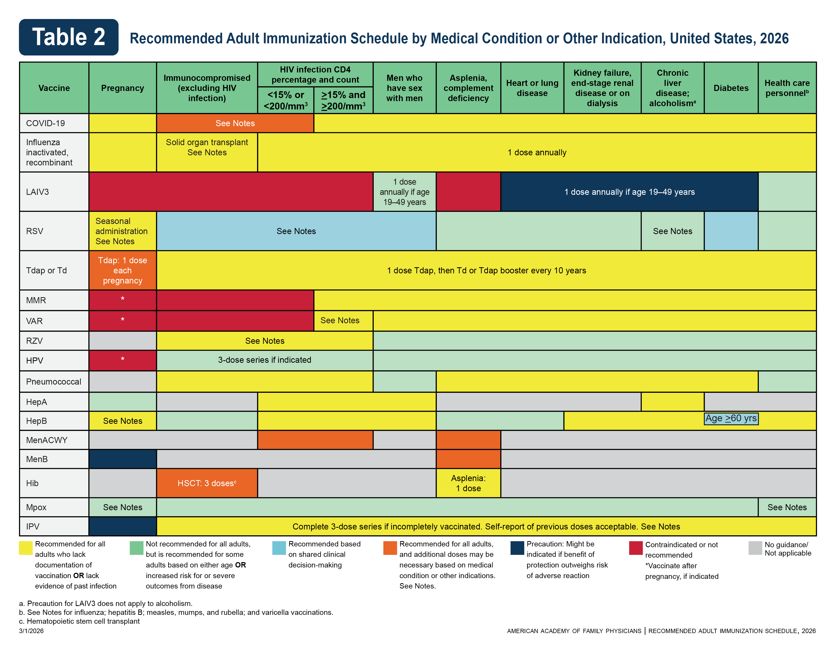 成人免疫接种计划 | AAFP — Adult Immunization Schedule | AAFP