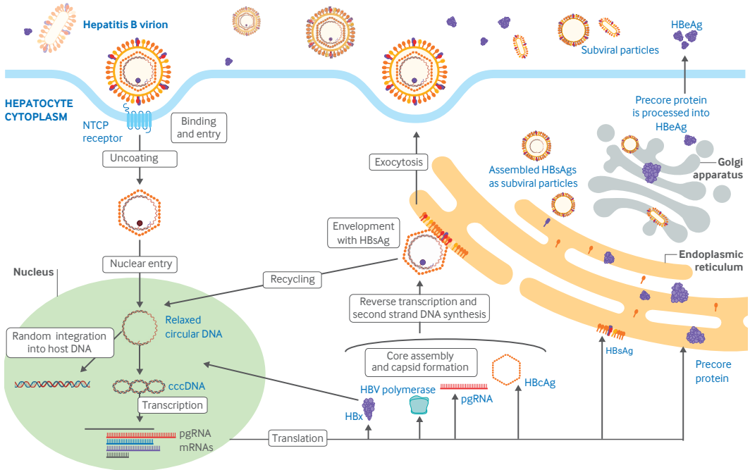 图1:乙型肝炎病毒(HBV)生命周期。cccDNA=共价闭合环状脱氧核糖核酸;HBcAg=乙型肝炎核心抗原;HBeAg=乙型肝炎e抗原;HBsAg=乙型肝炎表面抗原;mRNA=信使核糖核酸;NTCP=钠牛磺胆酸共转运多肽;pgRNA=前基因组核糖核酸