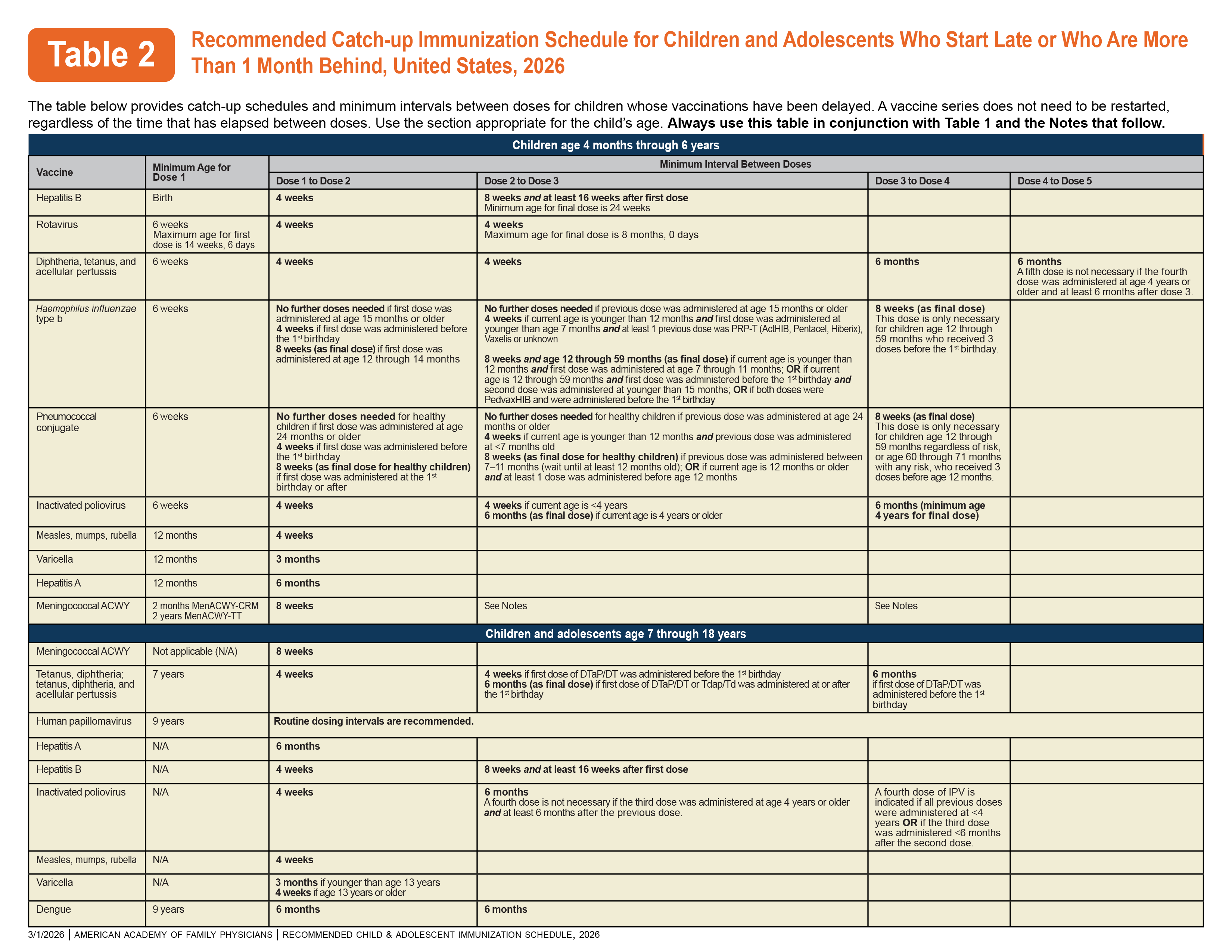 美国疾病控制与预防中心 (CDC) 的 2026 年免疫接种计划(未经美国家庭医师学会 (AAFP) 认可)可在此处找到。