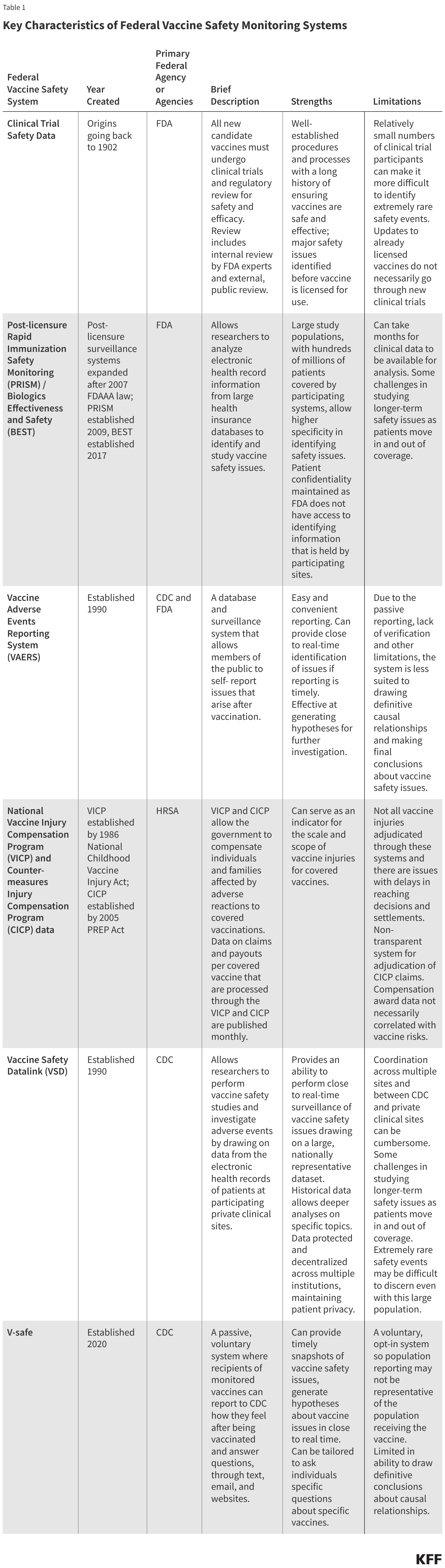 政府内外的专家对有关联邦疫苗安全监测不足的说法提出了质疑,称联邦政府实际上确实拥有能够追踪疫苗安全性的系统,而且这些系统共同能够识别出疫苗接种带来的重要安全信号或重大不良事件。这些系统包括对疫苗获批使用前后在监管审查过程中收集的数据进行审查、分析公众自行报告的疫苗伤害案例,以及在全国范围内对患者病历数据进行持续监测和分析。在大多数情况下,这些系统已经存在了数十年,并且能够识别出过去的疫苗安全问题。