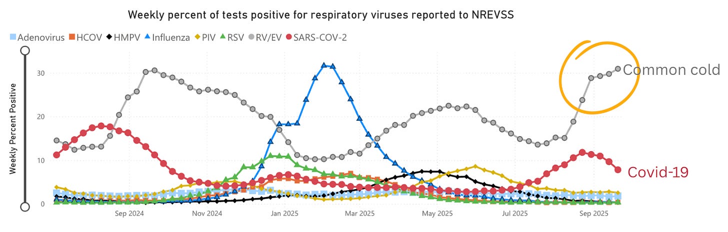 普通感冒(下方灰线)仍在流行,随着孩子们返校并形成新的社交圈,9月底出现了典型的感染激增。感染高峰随时可能到来。