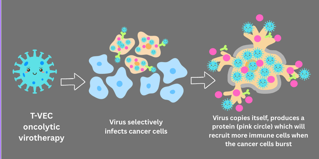 T-VEC(Imlygic™) 是首个获得 FDA 批准用于治疗黑色素瘤的溶瘤病毒疗法(2015 年)。它由一种改良的单纯疱疹病毒制成,直接注射到肿瘤内,而非通过感染的方式给药。该病毒经过精心设计,能够杀死癌细胞并刺激免疫反应。为了使其成为一种有效的疗法,该病毒进行了一些关键的改造,包括赋予病毒产生一种蛋白质的能力,这种蛋白质如同信标一般,能够募集免疫细胞至肿瘤并帮助摧毁肿瘤。