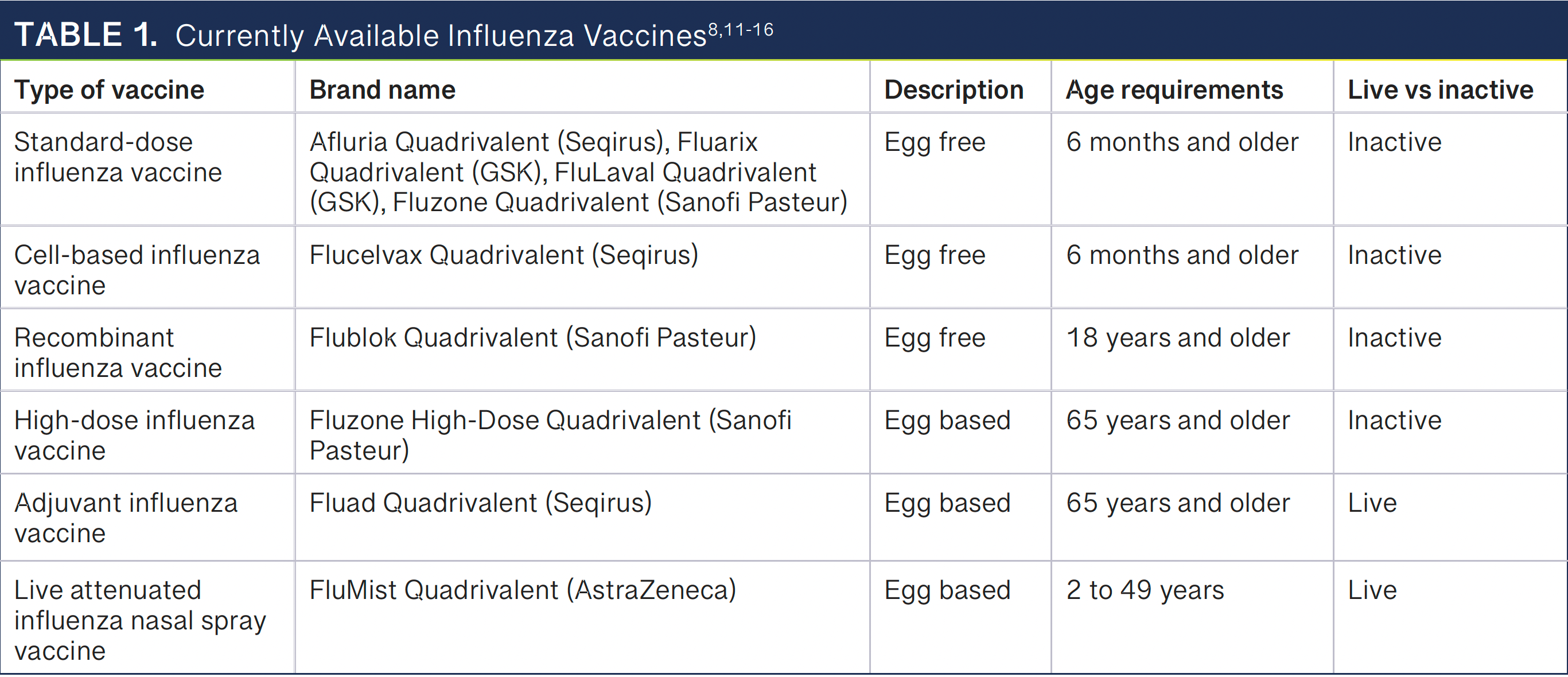 CDC 建议所有从 6 个月大开始的患者都接种非活性流感疫苗,尤其是那些与癌症患者密切接触的患者(即照护者).3,5,8-10 表18,11-16列出目前可用的流感疫苗。