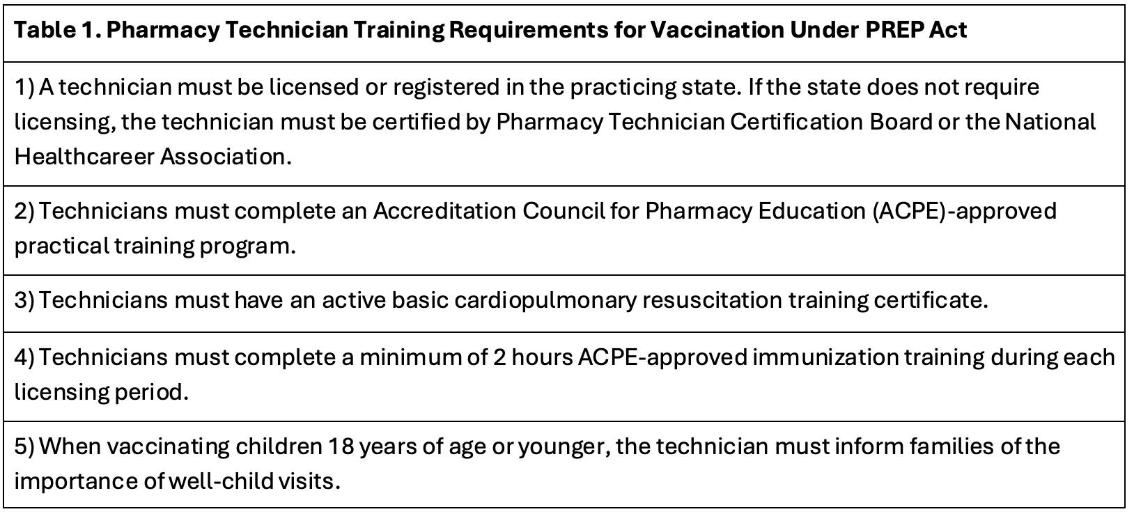 通过2020年10月通过的《针对COVID-19的医疗对策公共准备和应急准备(PREP)法案》修正案,联邦政府允许经过适当培训的药房技术人员进行免疫接种。美国卫生与公众服务部 (HHS) 定义了药房技术人员根据 PREP 法案有资格提供疫苗接种的流程。 表 1 总结了这些要求。