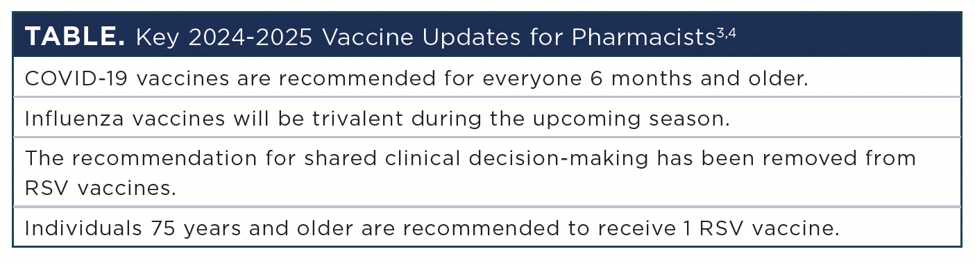 药剂师应了解秋季疫苗的几个关键更新(表3,4).2023年,超过75,500人死于新冠肺炎,在2023-2024年流感季节,约45,000人死于流感相关并发症。3药店提供的疫苗可以在减少这些统计数字方面发挥重要作用。