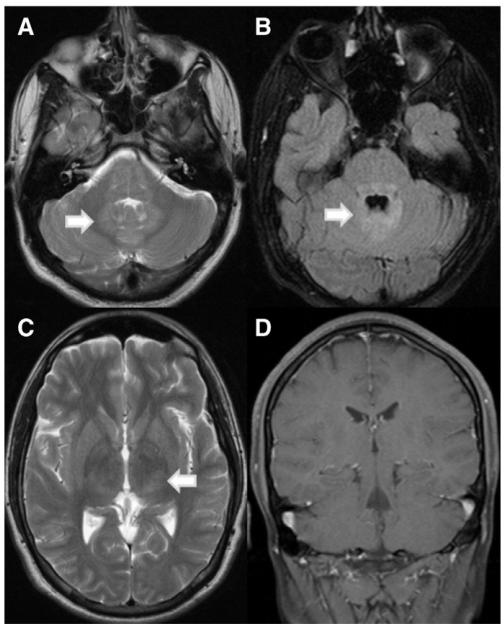 与狗或蝙蝠变种相关的人类狂犬病导致MRI异常,表现为脑干、丘脑、下丘脑、海马体和基底神经节、皮层下和深部白质以及脊髓前角的定义不明确的T2加权高信号:这些可能是由于病毒引起的神经元损伤所致[3,4,11,31,44,51](图1)。钆对比剂增强的病变(提示血脑屏障破坏)仅在狂犬病患者昏迷时出现,或在组织移植后感染的患者中出现[7,11]。