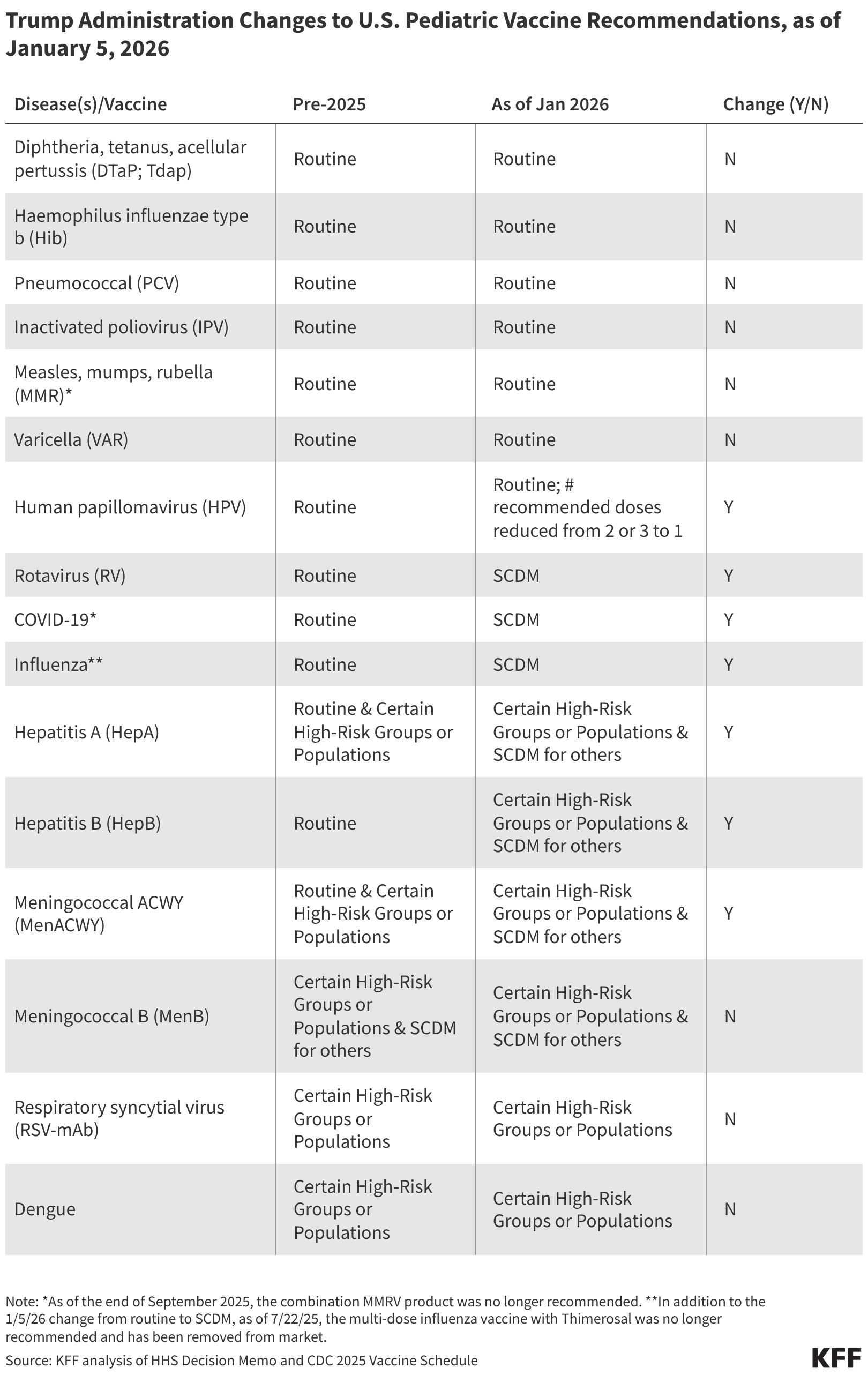 正如人们普遍预期的那样,继近期总统备忘录之后,美国卫生与公众服务部 (HHS) 于 2026 年 1 月 5 日发布了一份备忘录 ,对政府推荐的儿童疫苗接种计划进行了重大调整,此前已于 2025 年做出过其他调整。这些调整总体上减少了推荐给所有儿童的疫苗种类,因此对儿童免疫接种和美国公共卫生产生了重大影响,尤其是在儿童疫苗接种率已经下降以及流感和麻疹等疾病持续爆发的背景下。虽然最终由各州而非联邦政府决定推荐给儿童接种哪些疫苗以及入学所需接种哪些疫苗,但联邦政府对疫苗政策和获取途径拥有重大影响力 。本政策简报概述了这些调整及其若干影响。
