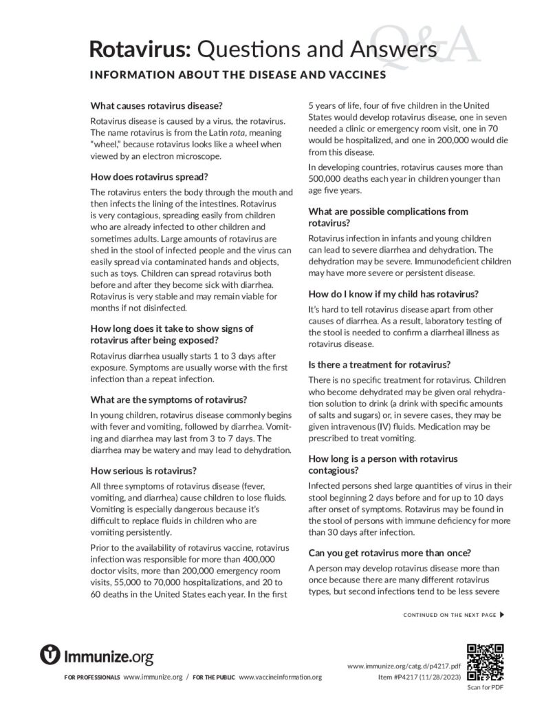 费城儿童医院疫苗教育中心提供的轮状病毒情况说明书和问答。还有西班牙语版本可供使用。