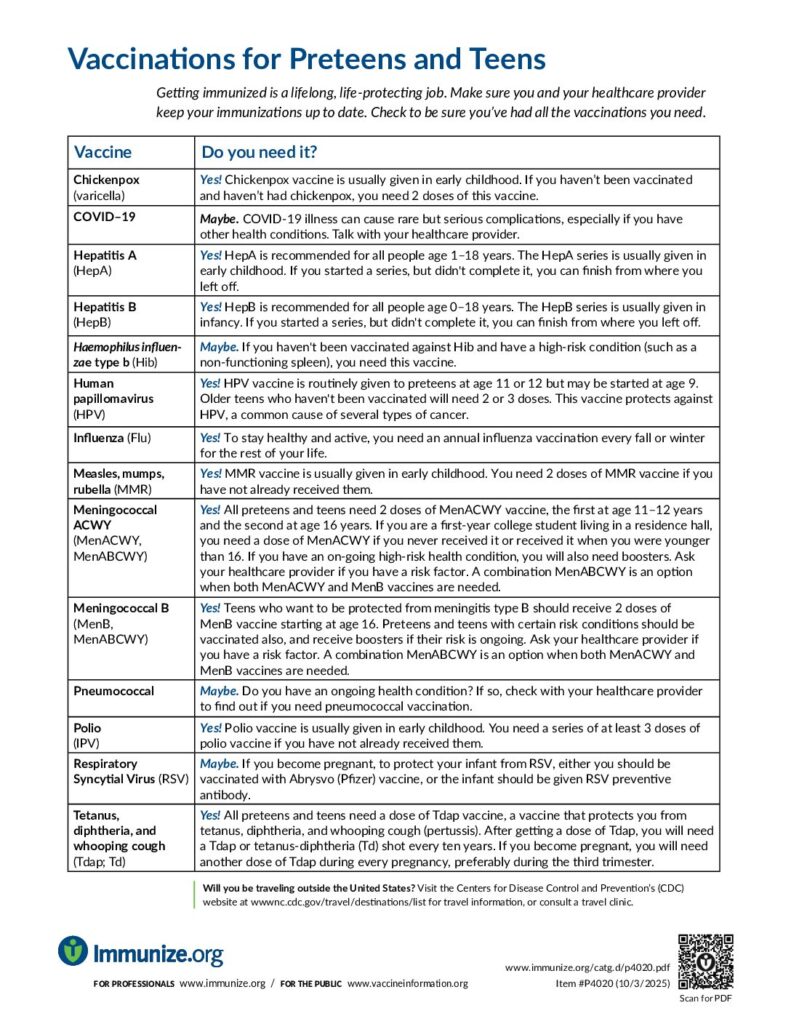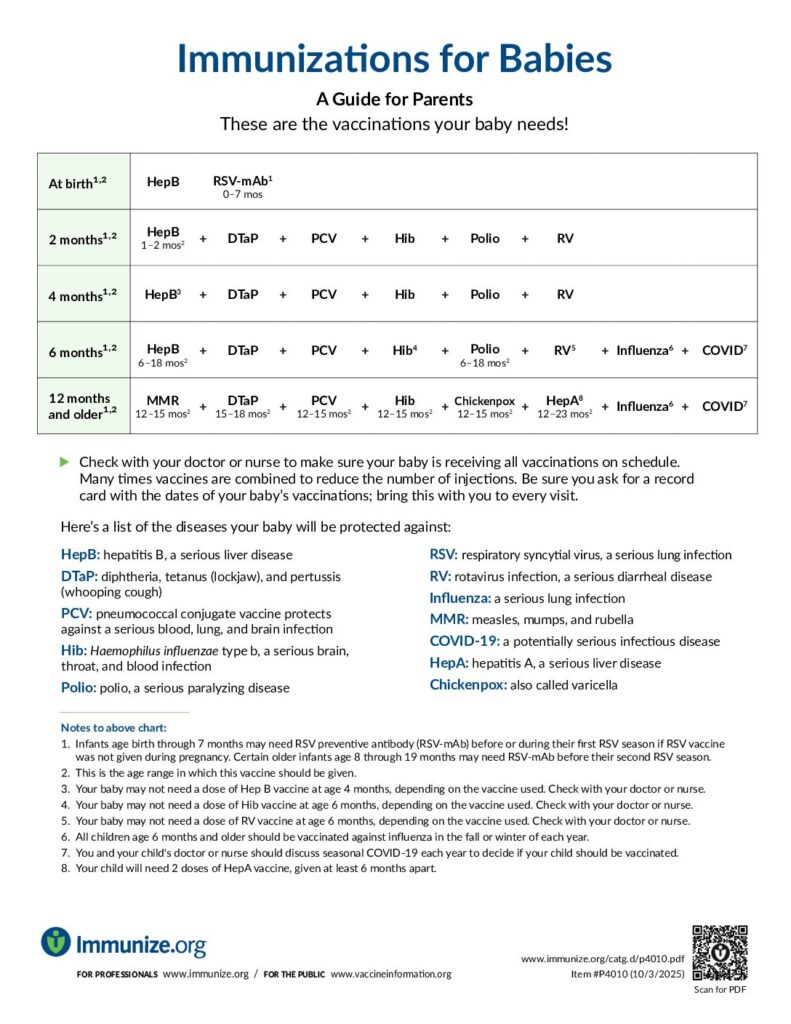 接种疫苗是一项终生的、保护生命的工作。与您的医疗保健提供者讨论您的孩子需要哪些疫苗以及何时应该接种疫苗。有关更多信息,请查看推荐的免疫计划: