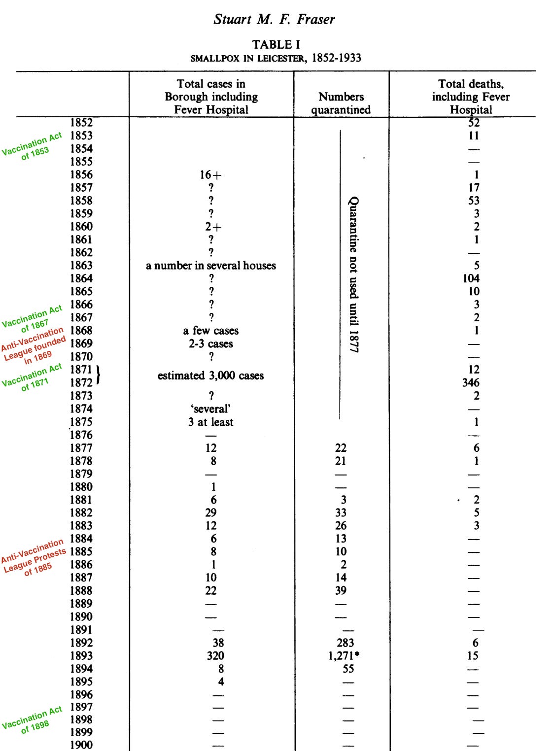 1869 年反疫苗联盟成立后,天花疫苗接种率下降,导致天花卷土重来;1885 年反疫苗联盟抗议活动后,天花再次爆发。