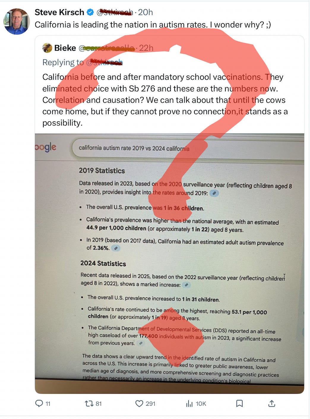 - 史蒂夫·基尔施 (Steve Kirsch) 想做家长调查以找出自闭症的原因