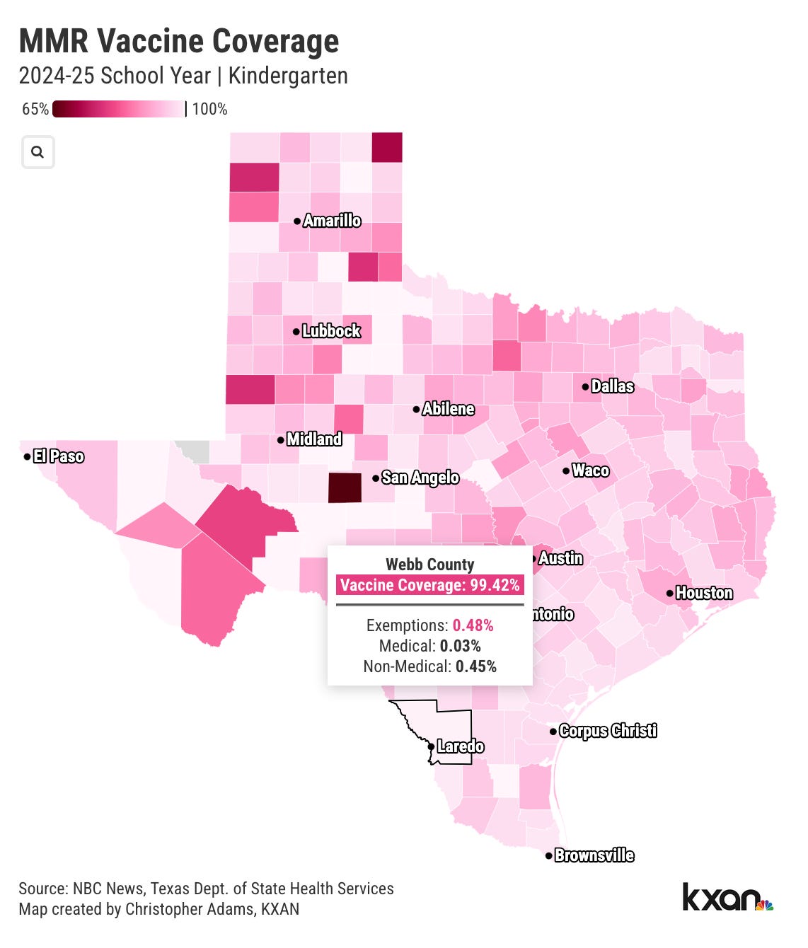 德克萨斯州韦伯县的公立和私立学校,幼儿园儿童的疫苗接种率高达 95% 至 100%。