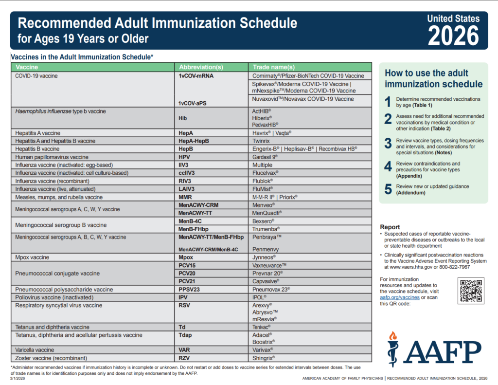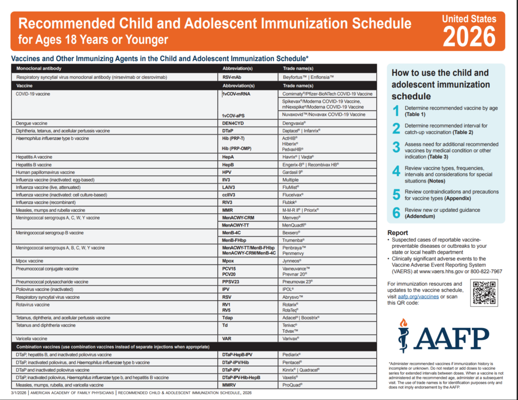 2026 年 AAP 时间表得到了其他 12 个美国医学、护理和药学专业组织的认可:美国家庭医师学会 (AAFP)、美国助产士学院 (ACNM)、美国妇产科医师学会 (ACOG)、美国医学会 (AMA)、美国药剂师协会 (APhA)、医学专科协会理事会 (CMSS)、美国传染病学会 (IDSA)、全国儿科护士执业医师协会 (NAPNAP)、全国医学会 (NMA)、儿科传染病学会 (PIDS)、儿科药学协会 (PPA) 和青少年健康与医学协会 (SAHM)。