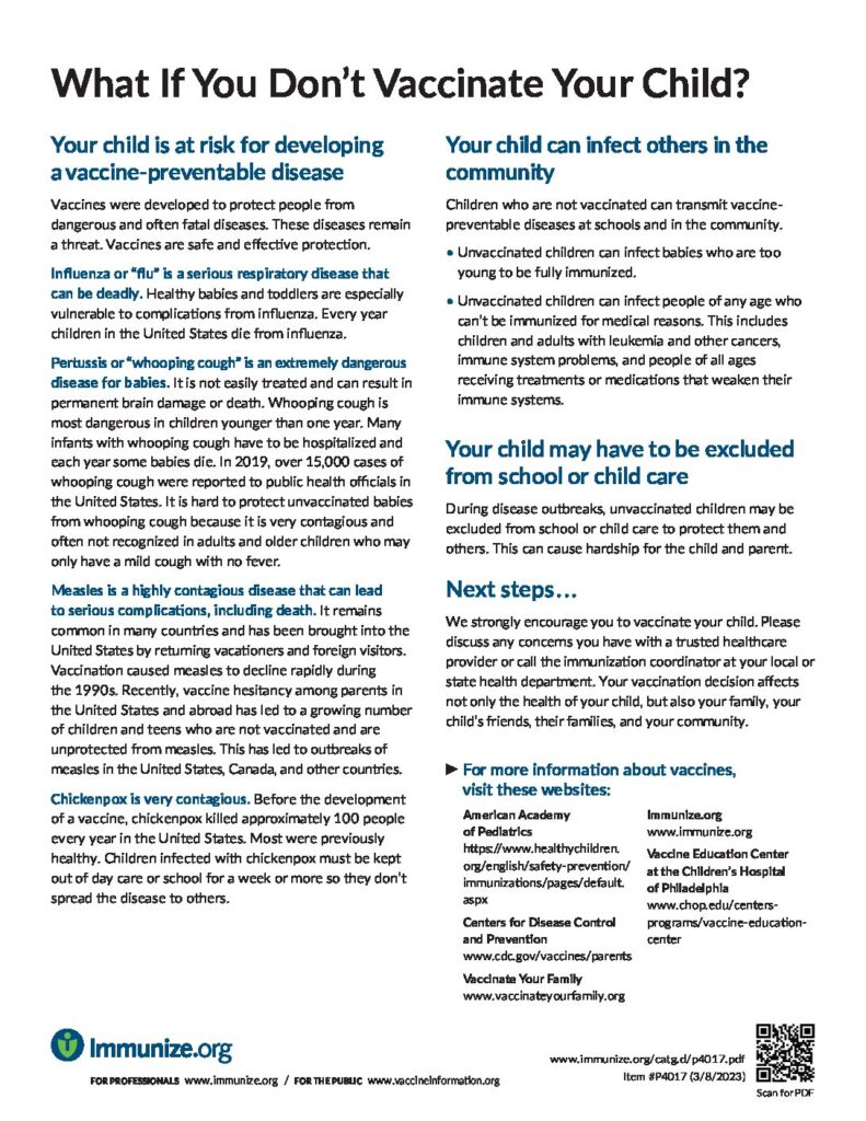 - 如果儿童不接种疫苗,他们可能会将疾病传播给其他年龄太小而无法接种疫苗的儿童或免疫系统较弱的人,例如移植受者和癌症患者。这可能会导致这些弱势群体出现长期并发症甚至死亡。