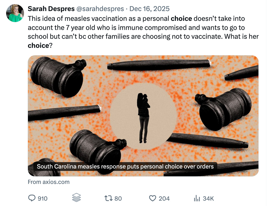 如今,人们谈论疫苗时, 总会听到 “个人选择” 这个概念 。